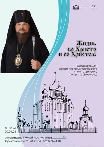 В основе названия выставки – автобиографическая книга архиепископа Питирима «Жизнь во Христе и со Христом». На выставке будут представлены фотографии, документы, облачение и личные вещи архипастыря из коллекции, переданной Национальному музею РК в 2025 году, и из архива прихода Свято-Казанского храма Сыктывкарской епархии Московского патриархата Русской Православной Церкви. Ждем вас в Литературном музее И.А. Куратова, ул. Орджоникидзе, 2. Справки по телефонам: 44-21-34, 89087164084.