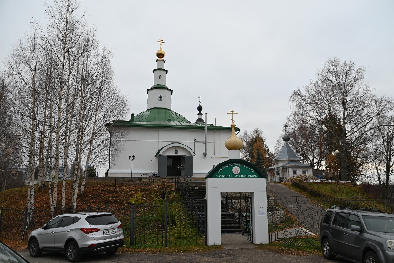 Богослужение, состоявшееся в храме во имя святителя Стефана Пермского, было посвящено также памяти многочисленных святых, чтимых Церковью в этот день. За литургией молитвенно почтили память: апостола от 70-ти Иакова Алфеева (I), преподобных Андроника и супруги его Афанасии (V), святого Стефана Нового Бранковича, праведных Авраама праотца и племянника его Лота (2000 г. до Р. Х.), мучеников Еввентия (Иувентина) и Максима воинов (361–363), святой Поплии исповедницы, диакониссы Антиохийской (ок. 361–363), преподобного Петра Галатийского (IX), а также священномучеников Константина Сухова (1918) и Петра Вяткина (1918), священномученика Константина Аксенова (1937) и преподноисповедника Севастиана (Фомина), архимандрита Карагандинского (обретение мощей, 1997). Михайло-Архангельский мужской монастырь, расположенный на двух холмах, был основан святителем Стефаном Пермским в XIV веке и стал первой православной обителью в Коми крае. Храм во имя святителя Стефана Пермского, где проходила служба, был построен и освящен в 1761 году. По преданию, он возведен на месте деревянной кельи самого апостола зырянского края — святителя Стефана. Монастырь, упраздненный в 1764 году, был возрожден для монашеской жизни в 1996 году. В его стенах под спудом почивают мощи духовных преемников св. Стефана — святителей Герасима, Питирима и Ионы, Усть-Вымских чудотворцев. Его Высокопреосвященству за богослужением сослужили благочинный Усть-Вымского церковного округа протоиерей Василий Дзерин, штатный священник монастыря иерей Сергий Логачев, духовенство ближайших приходов, а также приглашённое духовенство. Диаконский чин возглавил протодиакон Андрей Маков. За литургией была вознесена молитва о Святой Руси. По окончании богослужения духовенство во главе с правящим архиереем прошло крестным ходом в храм Трех Святителей, где у места упокоения мощей святителей Герасима, Питирима и Ионы был совершен благодарственный молебен. Завершил свой визит в обитель митрополит Филипп проповедью, обращённой к верующим, собравшимся в этот день в Стефановском храме для совместной молитвы и встречи с архипастырем.