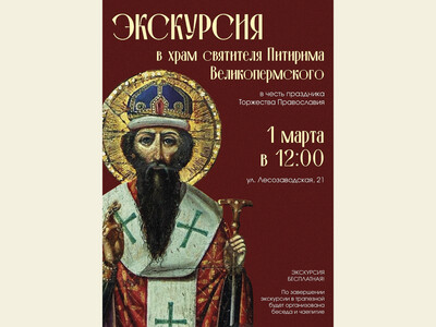 Расписание богослужений в этот день: В храме святителя Питирима Великопермского: в 7:40 — Божественная литургия. В Свято-Стефановском кафедральном соборе: в 8:40 — воскресная Божественная литургия. Экскурсия и общение: Сбор гостей в 12:00, начало экскурсии в 12:15. Адрес храма: улица Лесозаводская, 21. В программе: История и смысл праздника Торжества Православия, его связь с почитанием икон. Рассказ о создании храма и его внутреннем убранстве. Житие святителя Питирима, епископа Великопермского, небесного покровителя храма (день памяти — 1 сентября по новому стилю). Экскурсию проведут настоятель храма протоиерей Алексий Муравский, руководитель Отдела религиозного образования и катехизации Сыктывкарской епархии, и историк, регент храма Нина Николаевна Нолкен. По завершении экскурсии в трапезной вас ждут чаепитие и беседа со священниками. Справка: Краткое житие святителя Питирима, епископа Великопермского Святитель Питирим был избран на Пермскую кафедру после гибели святителя Герасима († после 1441 г.). До этого он в сане архимандрита настоятельствовал в Чудовом монастыре. Епископ Питирим утверждал христианскую веру среди зырян и вогулов (манси). Своей проповедью он многих обратил ко Христу, чем вызвал гнев предводителя вогулов Асыки. 19 августа 1455 (или 1456) года, когда святитель совершал освящение воды на мысе при слиянии рек Ваги и Вычегды, Асыка убил его. Память совершается 1 сентября (по новому стилю).