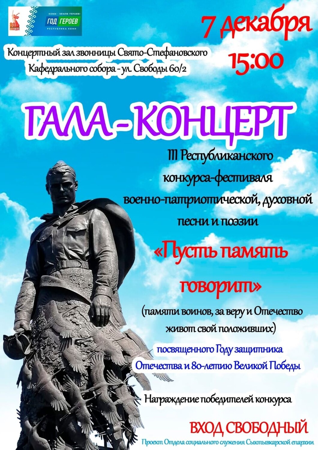 Мероприятие посвящено Году защитника Отечества и 80-летию Великой Победы. Его главная цель — почтить память воинов, положивших свои жизни за веру и Отечество, сохранить и передать молодому поколению светлую благодарность за их подвиг. В программе гала-концерта — выступления лучших конкурсантов, творческие номера, пронизанные любовью к Родине и высокими духовными идеалами. Состоится торжественная церемония награждения победителей конкурса-фестиваля. Вход на мероприятие свободный для всех желающих. Ждём вас, чтобы вместе вспомнить героев, насладиться искренним творчеством и разделить чувство единства в благодарной памяти. Проект реализуется Отделом социального служения Сыктывкарской епархии. | |