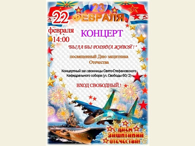 Дорогие друзья! Приглашаем вас на концерт «Была бы Родина живой!» , который состоится в зале звонницы Свято-Стефановского кафедрального собора. Дата: 22 февраля Время: 14:00 Вход свободный.
