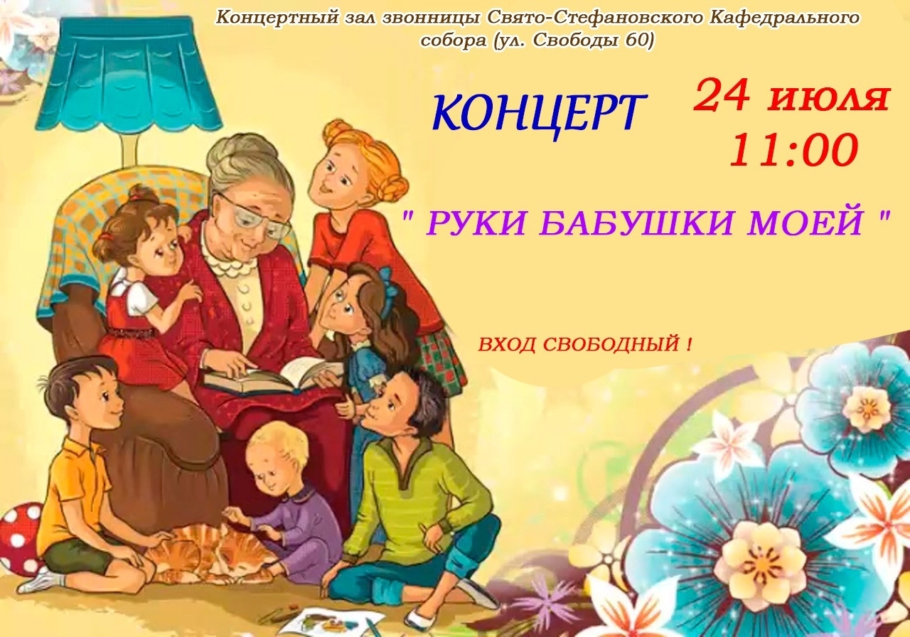 Приглашаем на концерт «Руки бабушки моей», посвященный памяти святой равноапостольной княгини Ольги. Концерт состоится 24 июля в 11:00 в зале звонницы Свято-Стефановского кафедрального собора. | |