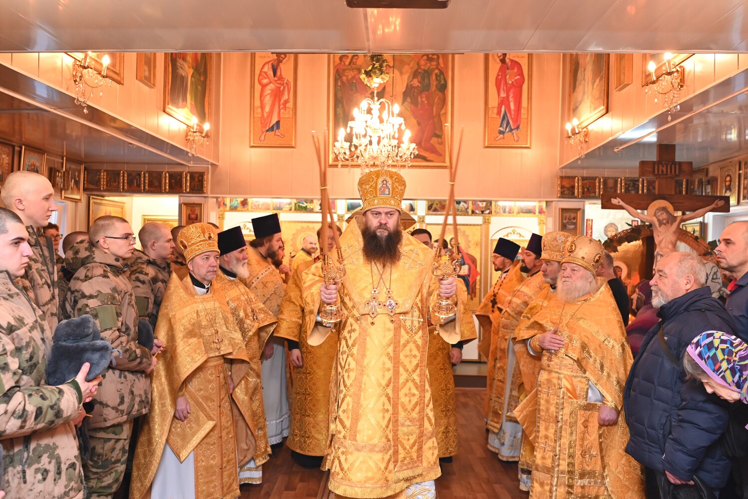 Диаконский чин возглавил клирик кафедрального собора диакон Артемий Юркин. Богослужебные песнопения исполнил хор храма. После сугубой ектении протоиерей Феодор Федько вознёс молитву о восстановлении мира. По окончании Литургии было совершено славление празднику, после чего митрополит Филипп обратился к молящимся с архипастырским словом. На службе присутствовали и молились военнослужащие. Больше фотографий — https://vk.com/album-26012117_308290350