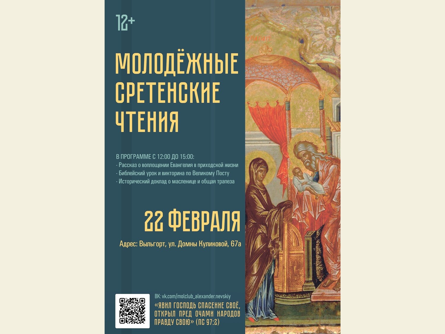 Встречаемся в 12:00 в храме Сретения Господня по адресу: с. Выльгорт, ул. Домны Каликовой, д. 67а. Программа мероприятия: