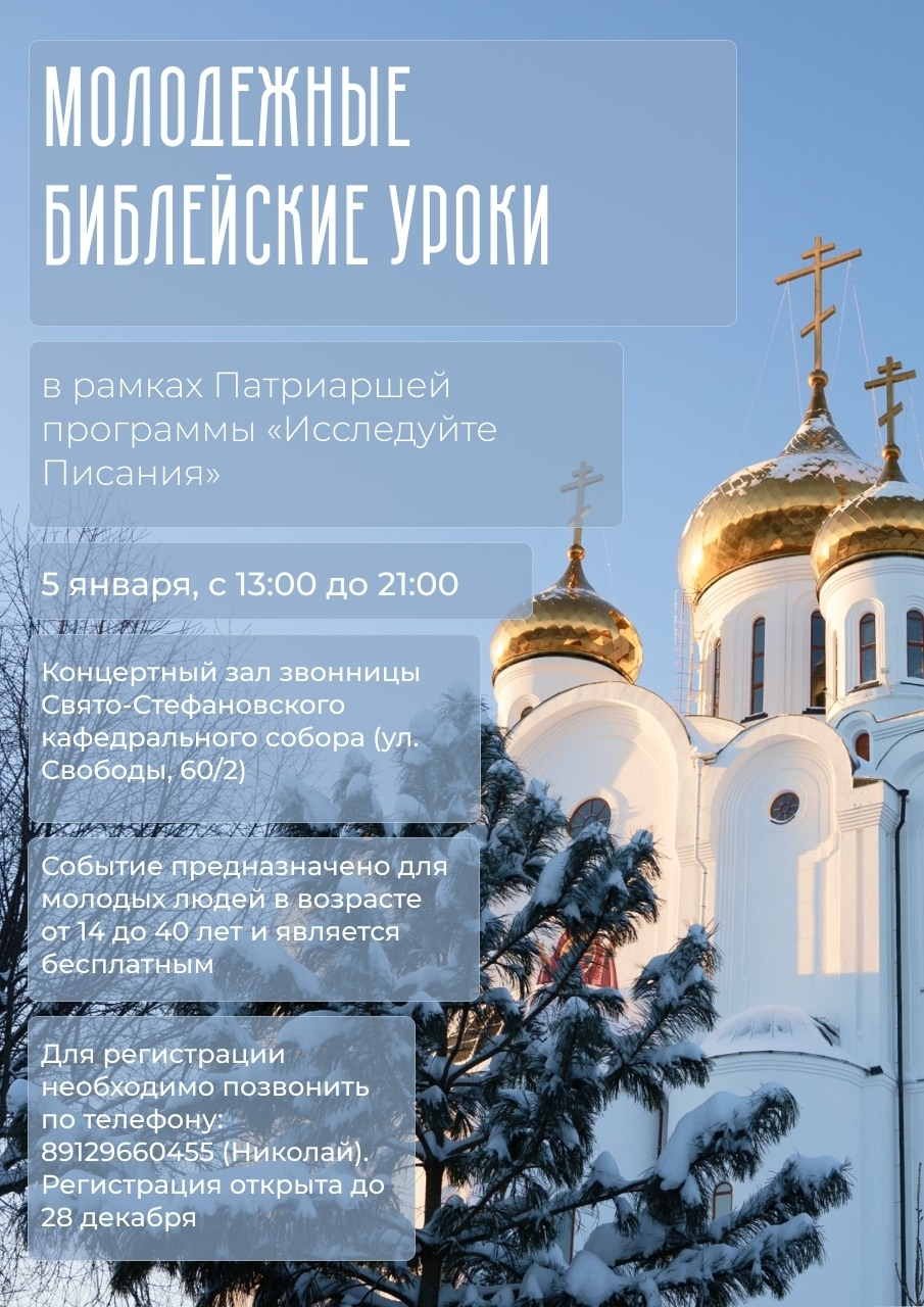 Участие в мероприятии предназначено для людей в возрасте от 14 до 40 лет и является бесплатным. Эта встреча — прекрасная возможность глубже понять смысл приближающегося праздника. Всё, что мы будем изучать и обсуждать, духовно подготовит наши сердца к благоговейной встрече Рождества Христова. Для регистрации необходимо написать или позвонить организатору — Николаю, учащемуся Сыктывкарского центра церковных специалистов: Телефон / WhatsApp: +7 (912) 966-04-55 Регистрация открыта до 28 декабря. | |