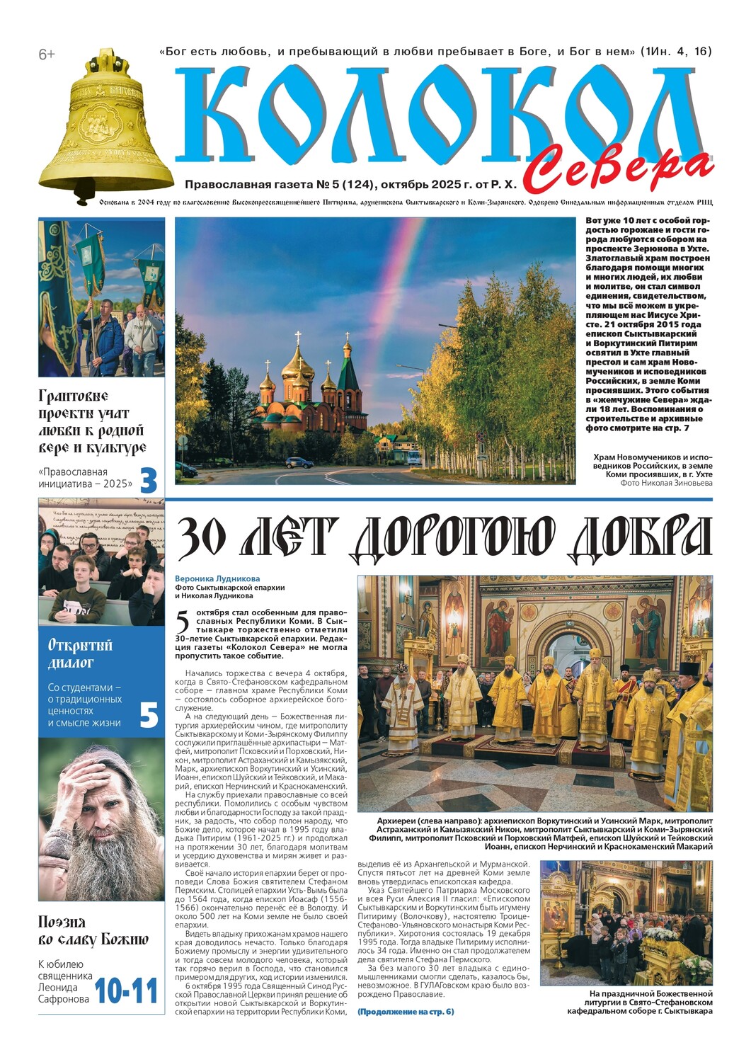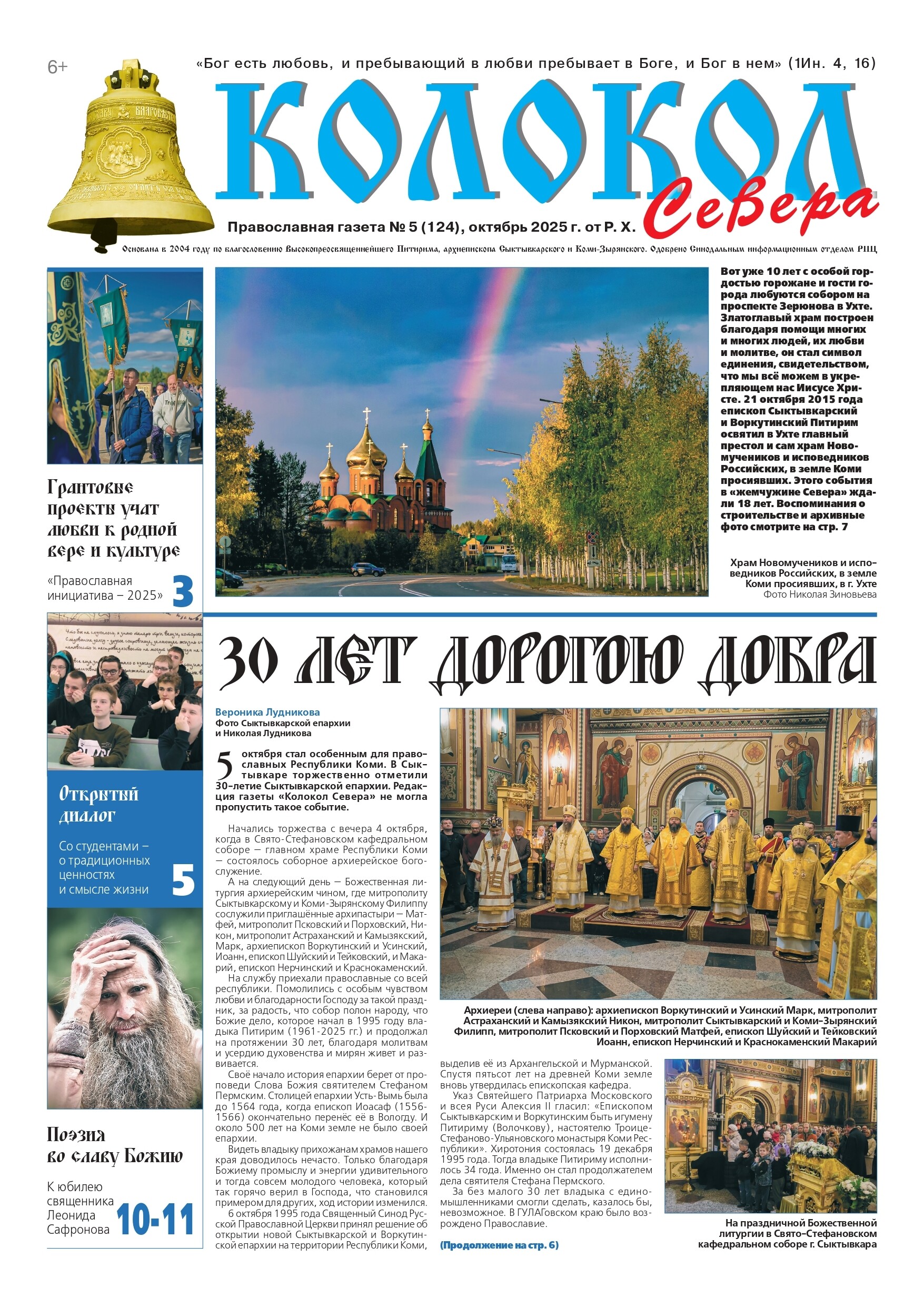 Читайте в новом номере в рубрике «Событие»: - 30 лет дорогою добра - в Республики Коми торжественно отметили 30-летие Сыктывкарской епархии; - Верили, строили, молились - Вот уже 10 лет с особой гордостью горожане и гости города любуются собором Новомучеников на проспекте Зерюнова в Ухте. В рубрике «День за днём»: - Воздвижение со святителем Тихоном – праздник в этом году для верующих столицы Коми был отмечен двойной радостью — в эти дни в пределы Сыктывкарской митрополии впервые прибыла великая святыня; - Первый визит митрополита Филиппа в Ухту - глава Сыктывкарской митрополии совершил два богослужения, посетил четыре при хода в Ухтинском районе и встретился с воспитанниками Детского дома № 2; - Грантовые проекты учат любви к родной вере и культуре - «Православная инициатива – 2025»; - Главред «Колокола Севера» вошёл в состав Общественной наблюдательной комиссии Коми; - Новая книга о Стефане Пермском - девятый том российской издательско-просветительской серии «Святые России» презентовали в Сыктывкаре; - «В темнице был, и пришли ко Мне» - новое направление открыл Центр социальной помощи «Милосердие Ухта», волонтёры решили поддержать женщин в пенитенциарных учреждениях; - Открытый диалог - со студентами – о традиционных ценностях и смысле жизни поговорил в Ухтинском государственном техническом университете; - Подарок для чемпионов – книгу Николая Лудникова «Звёзды ухтинского спорта» выручили героям издания; - От сердца к сердцу - отзыв на книгу «Звёзды ухтинского спорта». В рубрике «Путешествуем по России»: - Остановить мгновение - подведены итоги фотоконкурса. В рубрике «Изучаем церковнославянский»: - «Во всем мне хочется дойти до самой сути...» - как распознать славянизмы. В рубрике «Литературная гостиная»: - Поэзия во славу Божию - к юбилею священника Леонида Сафронова. В рубрике «Первые шаги»: - Чтобы явилась слава Божия - энтузиасты за восстанавливают старинную церкви в Зеленце Республики Коми, приглашают всех к участию в этом благом деле; - Как отвечать на агрессию разъясняет руководитель миссионерского отдела Сыктывкарской епархии иеромонах Александр (Митрофанов). Новый номер газеты «Колокол Севера» читайте на сайте колоколсевера.рф в рубрике «Архив»: «Колокол Севера» № 5(124) октябрь 2025 г.
