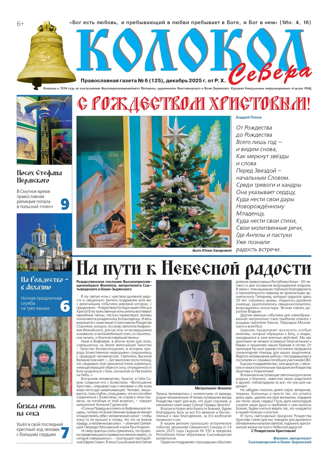 Читайте в новом номере: На пути к Небесной радости - Рождественское послание Высокопреосвященнейшего Филиппа митрополита Сыктывкарского и Коми-Зырянского. В рубрике «Митрополия»: - О вызовах времени - в Сыктывкаре состоялось долгожданное событие в сфере образования, культуры и духовной жизни, региональный этап XXXIV Международных Рождественских образовательных чтений; - Сестричество милосердия в Сыктывкаре набирает добровольцев; - Делегация из Коми - на XXVII Всемирном русском народном соборе. В рубрике «День за днём»: - Твори добро! – чем занимаются добровольцы общественных объединений Ухты; - 54-й гуманитарный конвой выполнил свою миссию - сбор средств в помощь российским бойцам в зоне СВО продолжается; - Памяти режиссёра ухтинской Пушкинианы - отошла ко Господу заслуженный работник культуры России и Республики Коми, обладатель государственной награды РФ — медали А. С. Пушкина Людмила Николаевна Дудина. В рубрике «Гость номера»: - «Если у человека нет духовного стержня, его легко сломить» - о вере, призвании и новых проектах в образовании с начальником Управления образования Ухты Натальей Коротковой. В рубрике «Ваше здоровье» - Главный секрет – в движении - главный редактор газеты «Колокол Севера», член Союза журналистов России Николай Лудников провёл для ухтинцев беседу на тему «Поговорим о здоровом образе жизни». В рубрике «Паломничество»: - На Рождество – в Абхазию - ночная праздничная служба на трёх языках. В рубрике «Чтобы помнили»: - Вызвал огонь на себя - ушёл в свой последний крестный ход человек с большим сердцем Игорь Бечков; - В Ухте открыт памятник Герою Донбасса Павлову Арсену; - Музей «Эхо войны» память о героическом прошлом. В рубрике «Изучаем церковнославянский»: - Рождественский словарь - Рождественские традиции в церкви приобретают новый, высокий смысл. В рубрике «Уроки истории»: - Посох Стефана Пермского - в Смутное время православная реликвия попала в польский «плен»; - Как жили наши предки – на чём в старину передвигались по рекам и морям в те далёкие времена, из какого материала изготавливали они свои лодки. В рубрике «Литературная гостиная»: - В гости к батюшке Филофею – рассказ Елены Русановой; - Листая зимние страницы - стихи к Рождеству. В рубрике «Первые шаги»: - «Красота Божьего мира» - глазами детей – о выставке юных художников в Сыктывкаре; - Для чего нужен посох? – на вопросы читателей отвечает настоятель храма-памятника Новомучеников г. Ухты отец Роман Ситник. Новый номер газеты «Колокол Севера» читайте на сайте колоколсевера.рф в рубрике «Архив»: http://www.колоколсевера.рф/wp-content/uploads/2025/12/Колокол_small.pdf