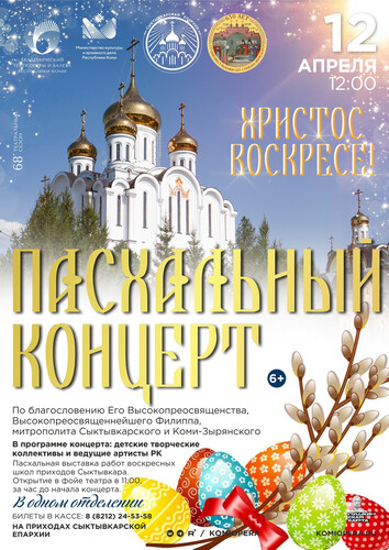 Мероприятие проходит по благословению митрополита Сыктывкарского и Коми-Зырянского Филиппа. О празднике Пасхи Пасха — главный праздник всего церковного года, смысловой центр православного календаря. Пасха — это праздник Воскресения Христова. Это переходящий праздник, его дата меняется год от года и зависит от лунно-солнечного календаря. Праздник не принадлежит к числу двенадцати двунадесятых праздников, а стоит как бы над их кругом, потому что его значение по-настоящему уникально. На Пасху мы вспоминаем о событиях, описанных в Новом Завете всеми четырьмя евангелистами — Матфеем, Марком, Лукой и Иоанном. Четыре Евангелия рассказывают о днях Страстной седмицы и Воскресении Христовом. В пятницу Страстной седмицы — Страстную, или Великую, пятницу — Спаситель был распят на кресте. Ученики похоронили Его в гроте — пещере, которая находилась рядом с Голгофой, горой, где совершались казни. История празднования Пасхи После Пятидесятницы, то есть сошествия Святого Духа на Апостолов, которое произошло в пятидесятый день после Пасхи, последователи Христа впервые начали проводить особую службу — Литургию. На Литургии совершалось Таинство Причастия, которое установил сам Христос на Тайной Вечере. Литургии совершались как раз по примеру Тайной Вечери. В первые века христианства Пасха отмечалась каждую неделю. В пятницу христиане постились и вспоминали страдания Спасителя на кресте. В воскресенье — радовались и славили Христа воскресшего. Весной, в период иудейской Пасхи, Пасха была особенно торжественной, потому что именно на иудейскую Пасху произошли распятие и Воскресение Христовы. Во II веке праздник становится во всех Церквях ежегодным. Сначала было как бы две Пасхи: «Пасха крестная» и «Пасха воскресная». Страдания и смерть Христа отмечались особым постом и назывались «Пасха крестная». Она совпадала с иудейской Пасхой, а постились до ночи с субботы на воскресенье. В воскресенье отмечалась Пасха радости, или «Пасха воскресная», то есть Воскресение Христово. Вопрос единого для всех христиан дня Пасхи поднял император Константин Великий. В 325 году он созвал епископов в город Никею в Малой Азии (Первый Вселенский собор). Епископы решили согласовывать день празднования Пасхи между христианскими общинами разных стран. Воскресение Христово постановили отмечать строго после иудейской Пасхи и всегда в воскресенье. Днем христианской Пасхи выбрали ближайшее воскресенье после первого весеннего полнолуния. Сначала восточные Церкви и Рим праздновали Пасху в один день, определяя вместе ее дату. Потом сообщение между ними прервалось, Восток и Рим начали праздновать Пасху каждый по своим вычислениям, часто в разные дни. Само слово «Пасха» стало общепринятым для обозначения праздника Воскресения Христова в V веке. Постепенно Пасха приобрела самое большое значение среди других христианских праздников, ее стали называть «праздников праздник». 12 апреля 2026 года — Пасха, Светлое Христово Воскресенье. Что вас ждет на концерте: Этот концерт — особый подарок горожанам к главному христианскому празднику. В программе — выступления детских творческих коллективов и ведущих артистов Республики Коми. В фойе театра развернется Пасхальная выставка работ воспитанников воскресных школ приходов Сыктывкара (открытие выставки в 11:00). Билеты: