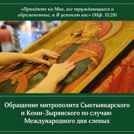 Приветствую Вас и всех вверенных Вашему попечению членов Общества с Международным днем слепых. В сей достопамятный день желаю воздать достойную хвалу Вашим ревностным трудам на ниве служения ближним, несущим крест тяжкого недуга. Сие служение есть подлинное исполнение евангельской заповеди: «Носите бремена друг друга, и таким образом исполните закон Христов» (Гал. 6:2). Церковь земная, странствующая в мире сем, призвана быть оком для слепых и стопою для хромых. Сей праздник есть знамение того, что немощное мира избрал Бог, чтобы посрамить сильное (1 Кор. 1:27). Ваше общество, помогая страждущим обрести опору в жизни, яко талант, данный от Господа, умножает на пользу всем. Молитвенно испрашиваю у Всеблагого Бога Вам, всем сотрудникам, активистам и членам Вашей организации неоскудевающей помощи свыше, великодушия, терпения и крепости сил. Да предстательством Пресвятой Владычицы нашей Богородицы и Приснодевы Марии дарует вам Господь мир, благоденствие и утешение в Духе Святом. С любовью о Христе и архипастырским благословением,
