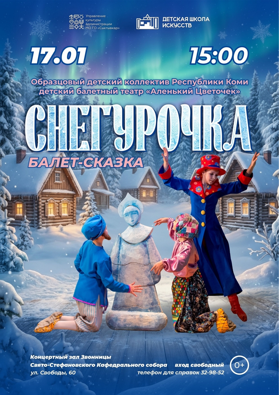 17 января в 15:00 в уютной атмосфере концертного зала звонницы Свято-Стефановского Кафедрального собора (ул. Свободы, 60/2) состоится долгожданная премьера балета-сказки «Снегурочка». Постановку представит жемчужина нашей республики — Образцовый детский коллектив Республики Коми, детский балетный театр «Аленький цветочек» под руководством Галины Юрьевны Ширяевой. Это уникальное событие, где юные артисты своим искусством расскажут трогательную историю, позволяющую в танце выразить светлые, возвышенные чувства. Приходите всей семьей, чтобы поддержать талантливых детей и прикоснуться к прекрасному. Вход на мероприятие свободный для всех желающих. Да пребудет с нами благодать Святого Духа, прославляющего Творца в творчестве и таланте во славу Божию!