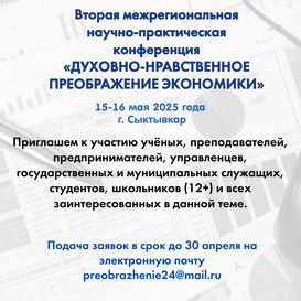 Уважаемые друзья и коллеги! Сыктывкарская епархия Русской Православной Церкви, Всемирный Русский Народный Собор (Коми региональное отделение), Институт социально-экономических и энергетических проблем Севера ФИЦ «Коми научный центр Уральского отделения РАН», Сыктывкарский государственный университет им. Питирима Сорокина, Ухтинский государственный технический университет, Коми республиканская академия государственной службы и управления, Сыктывкарский лесной институт, Управление образования МО ГО «Сыктывкар» объявляют о проведении второй межрегиональной научно-практической конференции «ДУХОВНО-НРАВСТВЕННОЕ ПРЕОБРАЖЕНИЕ ЭКОНОМИКИ» 15-16 мая 2025 года