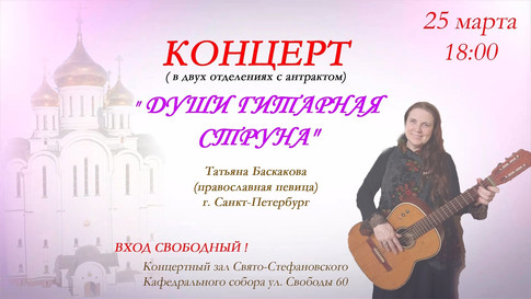 25 марта в 18:00 в Концертном зале Свято-Стефановского Кафедрального собора (ул. Свободы, 60/2) состоится концерт православной певицы Татьяны Баскаковой из Санкт-Петербурга. Вход свободный! Приглашаем всех желающих!