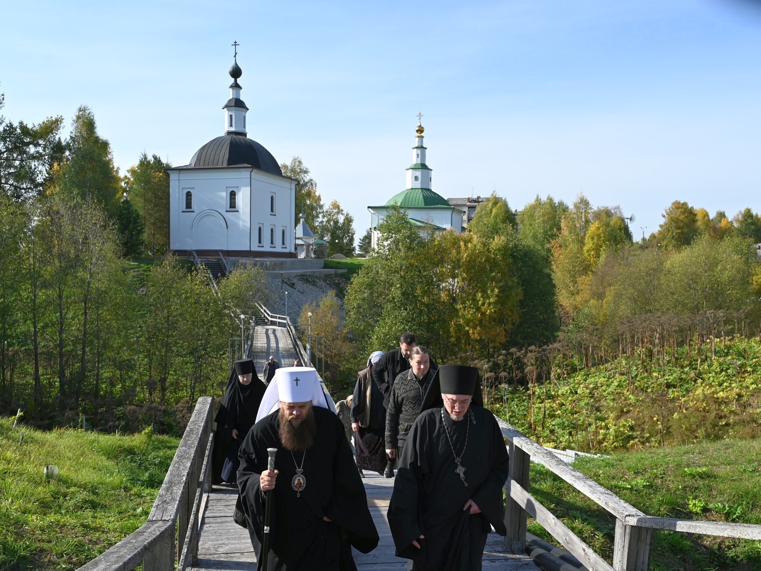 18 сентября 2025 года Высокопреосвященнейший Филипп, митрополит Сыктывкарский и Коми-Зырянский, совершил пастырский визит в одну из главных святынь Коми земли – Свято-Михаило-Архангельский мужской монастырь в селе Усть-Вымь. Это место обладает особой благодатью и уникальной историей. Монастырь, расположенный на двух живописных холмах, был основан святителем Стефаном Пермским напротив Владычного городка – первой кафедры Пермских архиереев. Именно здесь, на месте срубленной языческой березы-кумирницы, был возведен первый храм во имя Архистратига Божия Михаила. Возникшая в XIV веке обитель стала первым православным духовно-просветительским и миссионерским центром на всей территории Коми края. Здесь же под спудом почивают мощи Усть-Вымских чудотворцев – преемников свт. Стефана, святителей Герасима, Питирима и Ионы. Возрожденный для монашеской жизни в 1996 году, монастырь и сегодня является средоточием молитвы и духовной поддержки всей Республики Коми. У святых врат обители Его Высокопреосвященство встретил наместник монастыря игумен Силуан (Александров) с трудниками и сестрами, помогающими по хозяйству. Владыка митрополит в сопровождении отца наместника ознакомился с жизнью древней обители. Первым делом он посетил храм во имя святого Стефана Пермского, который, по преданию, был возведен на месте кельи самого просветителя зырян. Здесь, у истоков Православия на Коми земле, была вознесена молитва первому Усть-Вымскому святителю. Затем Владыка Филипп проследовал в храм-часовню Трех Святителей, где под спудом покоятся честные мощи святителей Герасима, Питирима и Ионы. Его Высокопреосвященство совершил краткий молебен у раки с мощами, с молитвой обратившись к небесным покровителям Коми края, испрашивая их предстательства и заступничества о всей пастве Сыктывкарской епархии. Также в ходе визита Владыка осмотрел братский корпус и хозяйственные постройки монастыря, побеседовал с наместником обители об укладе и текущих нуждах. Также было посещено монастырское кладбище, где похоронены главные устроители и благоукрасители монастыря. Особо были отмечены труды игумена Симеона (Кобылинского), который возрождал обитель с 1996 по 2021 год. Царство ему Небесное и вечный покой! За братской трапезой за чаем состоялась теплая, душеполезная беседа, в ходе которой обсуждались вопросы дальнейшего развития монастырской жизни. В частности, были намечены планы по устройству в обители архиерейских покоев, что позволит правящему архиерею чаще посещать древнюю святыню с возможностью оставаться на ночлег, укрепляя обитель своим отеческим участием и руководством. Этот визит стал еще одним важным шагом в поддержке и укреплении одной из самых почитаемых обителей, несущей свет Православия вот уже более шести столетий. В этот день у стен древней обители также состоялась встреча с прокурором Республики Коми Николаем Валентиновичем Егоровым. Находясь с рабочим визитом в Княжпоготском районе, он посетил древнюю обитель с паломничеством. Больше фотографий — https://vk.com/album-26012117_307430922