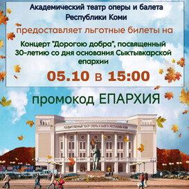 Дорогие братья и сестры, уважаемые прихожане! Сердечно приглашаем вас на великий праздник нашей епархии! 5 октября 2025 года мы вместе отметим 30-летие со дня образования Сыктывкарской епархии на Коми земле. Этот юбилей — яркая страница в истории возрождения Православия в нашем северном крае, который шесть веков назад просветил святитель Стефан Пермский. Его дело в ХХ веке продолжил епископ Питирим, приложив все силы для благоукрашения Северной Фиваиды. За 30 лет по молитвам и трудам всех верующих произошло настоящее чудо: · Было открыто 7 монастырей. Приходите на праздничный концерт «Дорога добра», где мы вместе вспомним страницы этой славной истории. · Дата: 5 октября 2025 года Особые условия для прихожан Театр предоставляет нашей общине льготную цену — скидку 75% на все билеты! Чтобы получить скидку, при покупке билета онлайн введите в специальное поле промокод: ЕПАРХИЯ Ссылка для покупки билетов: https://quicktickets.ru/komiopera/s1914 Не упустите уникальную возможность стать сопричастным к великому празднику нашей епархии! Приходите всей семьей, приглашайте друзей и близких. Давайте вместе прославим труды всех, кто несет свет веры на Коми земле! «Да будут все едино...» (Ин. 17:21)