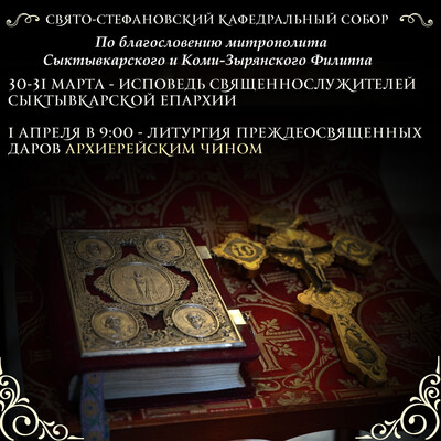Божественная литургия Преждеосвященных Даров архиерейским чином в Свято-Стефановском кафедральном соборе (ризница — черная). Начало в 9:00. Накануне, в понедельник и вторник, — исповедь для духовенства. 30 марта, понедельник, 15:00 – исповедь для священнослужителей города Сыктывкара и близлежащих районов. Троицкий приход (м. Давпон), г. Сыктывкар. Духовники епархии: протоиерей Михаил Козак, иеромонах Афанасий (Юдин). 31 марта, вторник, 15:00 – исповедь для священнослужителей отдаленных районов. Свято-Стефановский кафедральный собор, г. Сыктывкар. Духовники епархии: протоиерей Михаил Козак, иеромонах Афанасий (Юдин).