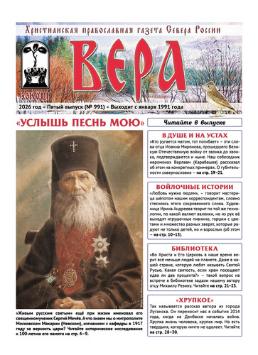 Читайте в номере: - Михаил Сизов в своём хронографе «Мысли в тишине» размышляет о том, почему искусственный интеллект в вопросах веры вреден. - В комментарии «Бесноватые» Игорь Иванов говорит о религиозной подоплёке войны на Ближнем Востоке, которая зиждется на безумной доктрине христианских сионистов. - Исторический очерк Владимира Григоряна «Неуместный святой» - о нелёгком жизненном пути митрополита Макария (Невского), который до конца своих дней продолжал помогать людям. - «Войлочные истории» (Елена Григорян и Мария Гурмизова). Беседа с московской мастерицей композиций из валяной шерсти Ириной Андреевой о её творчестве и способности согревать людям душу. - «Тот уголок земли...» - дневники редакционной экспедиции (продолжение, начало в №№ 981-990) из Пушкиногорья: беседа с прот. Михаилом Ивановым и история края в дни Великой Отечественной. - В статье «Что в душе, то на устах» Михаил Сизов с о. Варлаамом (Карабашевым) обсуждают проблему повсеместности матерной ругани в нашем обществе. - «Библиотека» (традиционная рубрика «Дневник священника» протоиерея Михаила Резина). История о том, как встреча с читателями в библиотеке обернулась разговором о главном. - «Колокольчик» для детей и родителей (Елена Григорян): «Нитью нарисуй коня» - о значении символики коня и где можно её увидеть. Задание: расшифровать пословицу. Познавательная статья о жаворонках. Задание: решить загадку. - «Болезненное примирение» (Юлия Сысоева). История о том, как онкология оказалась не приговором, а последним предупреждением. - Рассказ иерея Андрея Нестерова о чувстве долга и хрупкости жизни. - Заметки о почти забытом поэте Алексее Жемчужникове - «Огней духовных не туши». - В рубрике «Календарь» Игорь Иванов рассказывает об Иоанне Лествичнике и его «Лествице», которая объясняет, как разглядеть в себе тщеславие, гнев и иные пороки. - «Цветник духовный»: притча о том, что некоторые обязанности нужно выполнять самому. НА ФОТО: - Обложка газеты «ВЕРА» № 991 (5). - Отец Варлаам (Карабашев). - Алексей Жемчужников.