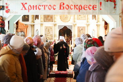 Богослужения Светлой седмицы исполнены пасхальной радости. Под сводами храма прозвучали песнопения, прославляющие Воскресшего Спасителя, которые исполнили певчие прихода. На сугубой ектении были возглашены особые прошения об Отечестве нашем и защитниках его. После сугубой ектении была вознесена молитва о Святой Руси. За литургией молились воспитанники Кочпонского психоневрологического интерната. Напомним, на Светлой седмице Царские врата алтаря остаются открытыми в знак того, что для человека снова открыты двери домой, к Отцу Небесному. После Причастия Святых Христовых Тайн был совершен праздничный крестный ход вокруг храма под трезвон колоколов, тропарь празднества «Христос Воскресе из мертвых» и пасхальные песнопения. Прихожане во главе с Владыкой с радостью прошли вокруг храма, во время хода читалось Евангелие и происходило окропление святой водой. Хочется напомнить, что в пасхальные дни во всех храмах хранится артос. Освящение артоса происходит в первый день Пасхи, после заамвонной молитвы Литургии. Священник читает особую молитву и окропляет артос святой водой. В субботу после литургии артос разрезается на части и раздается верующим. Артос не заменяет Святого Причастия (Тела и Крови Христовых). Его следует употреблять с благоговением, как святыню. После богослужения Владыка Филипп обратился к богомольцам с проповедью. Больше фотографий — https://vk.com/album-26012117_309599452